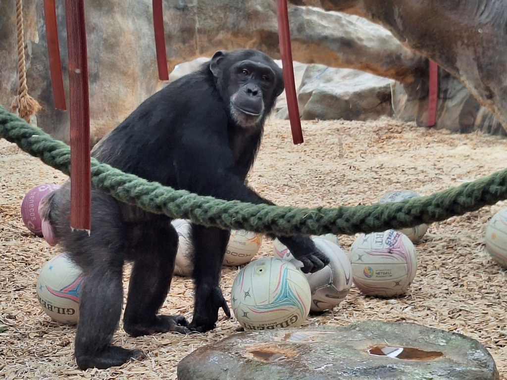 Finborough Ladies Netball Club kindly donated some netballs to our group of chimpanzees. At first, Tara, Kora and Talia were slightly confused by the new enrichment within their habitat. However, Talia quickly understood the joy that netball brings and was soon running around in excitement.
